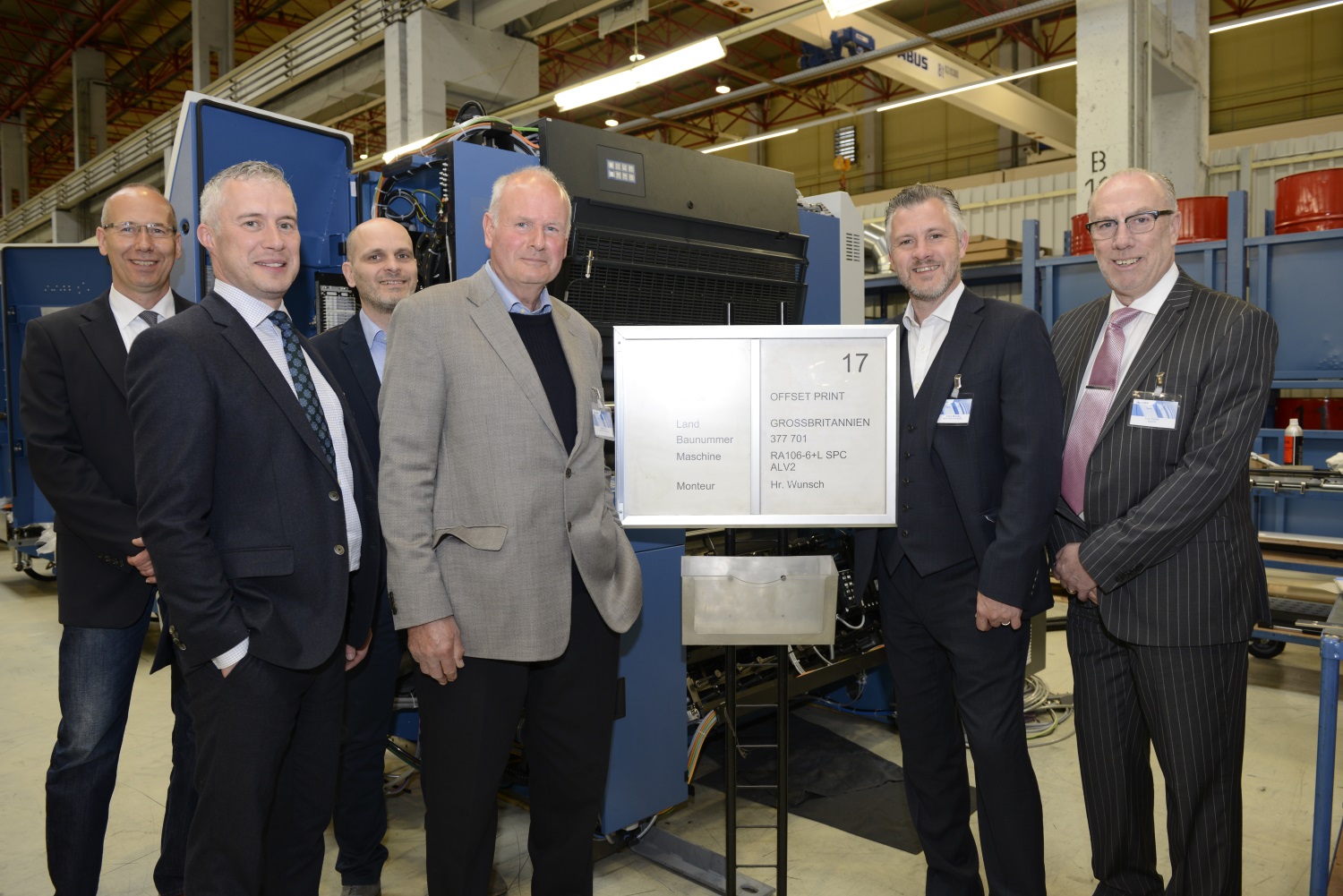 Offset Print and Packaging Chairman Hugh Jarvis (second left), Vince Brearey Managing Director - Operations (second right) and Edward Bone Managing Director - Sales (left) joined Area Sales Manager Len Taylor (right) in the 42,000 square metre assembly hall to view their machine on the production line.